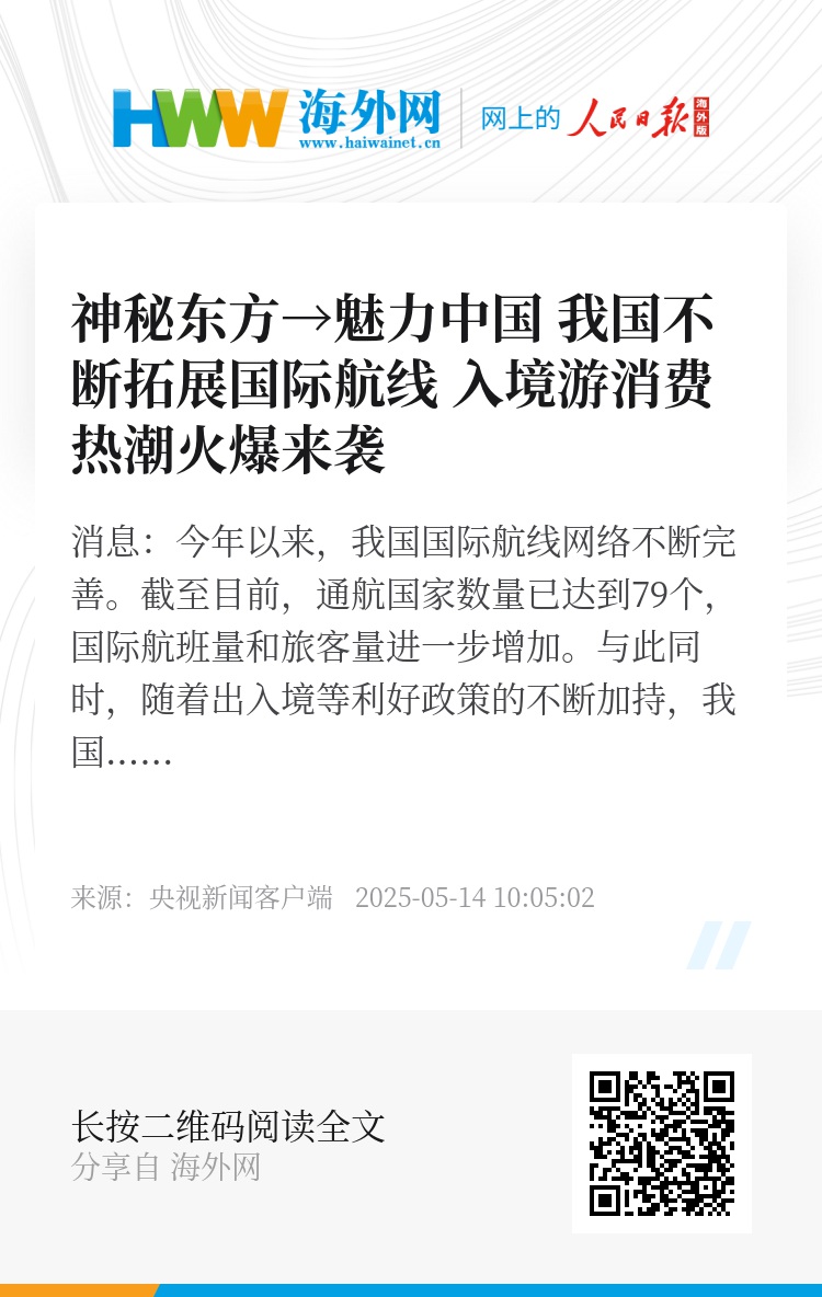 央视网消息:今年以来,我国国际航线网络不断完善。截至目前,通航国家数量已达到79个,国际航班量和旅客量进一步增加。与此同时,随着出入境等利好政策的不断加持,我国入境游迎来爆发式增长。