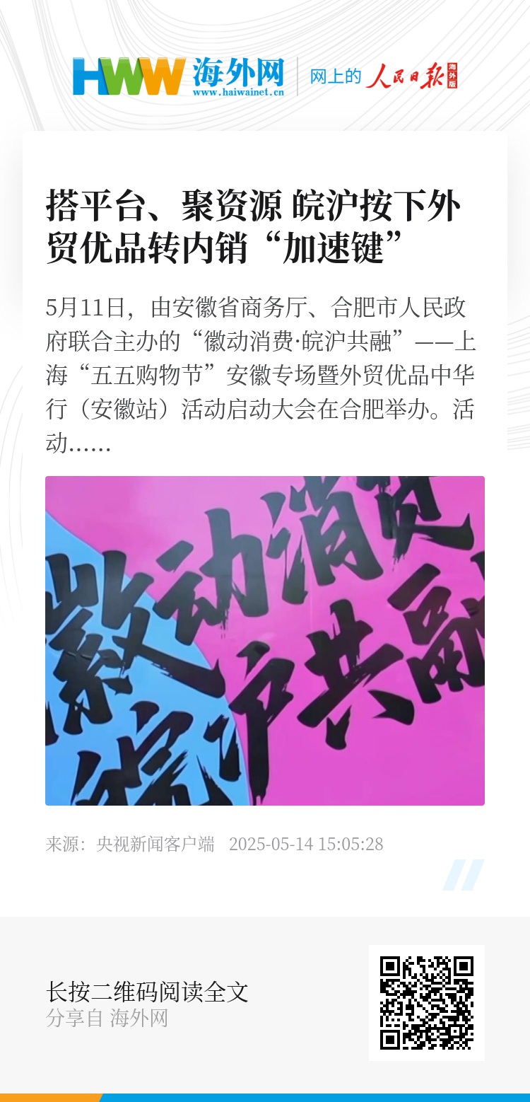 5月11日,由安徽省商务厅、合肥市人民政府联合主办的“徽动消费·皖沪共融”——上海“五五购物节”安徽专场暨外贸优品中华行(安徽站)活动启动大会在合肥举办。活动现场设置了75个特色摊位,同步组织安徽外贸优品、老字号、好网货、长三角优质商品等促销活动。