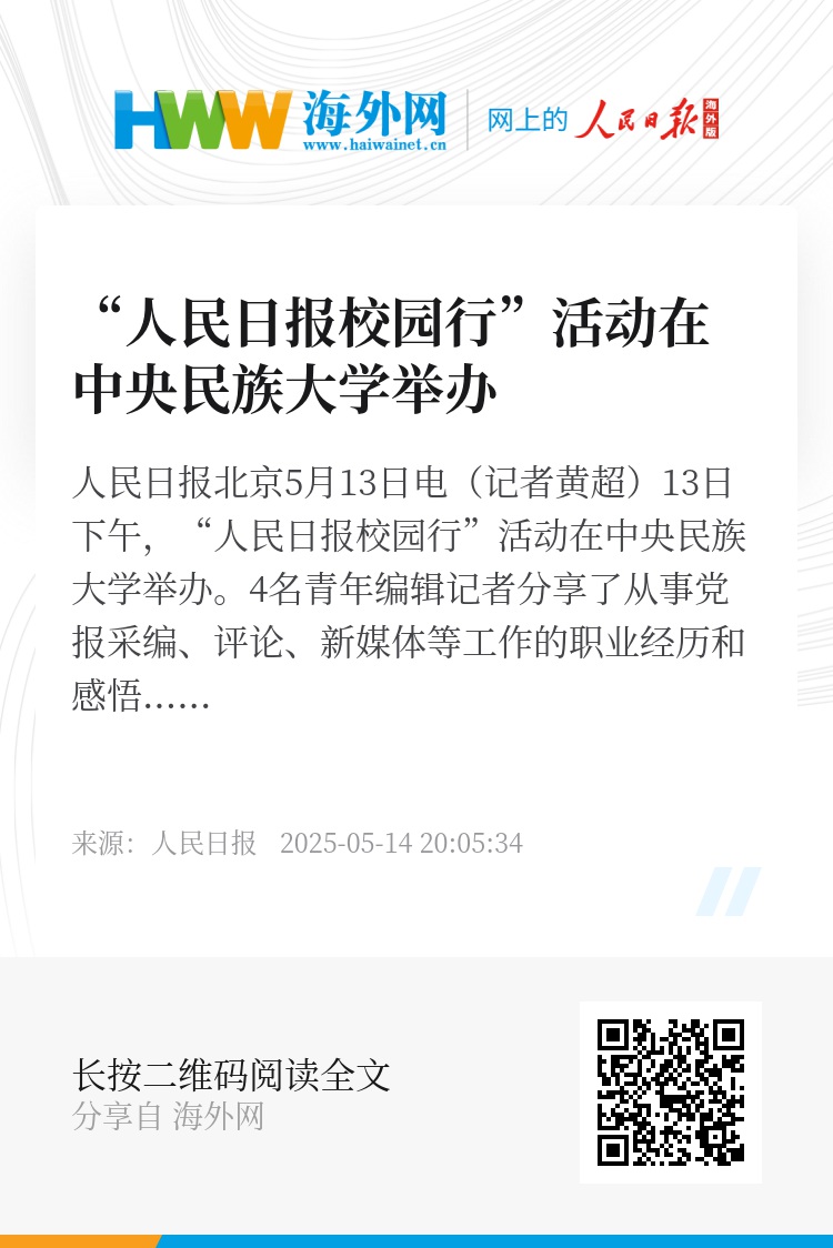人民日报北京5月13日电(记者黄超)13日下午,“人民日报校园行”活动在中央民族大学举办。