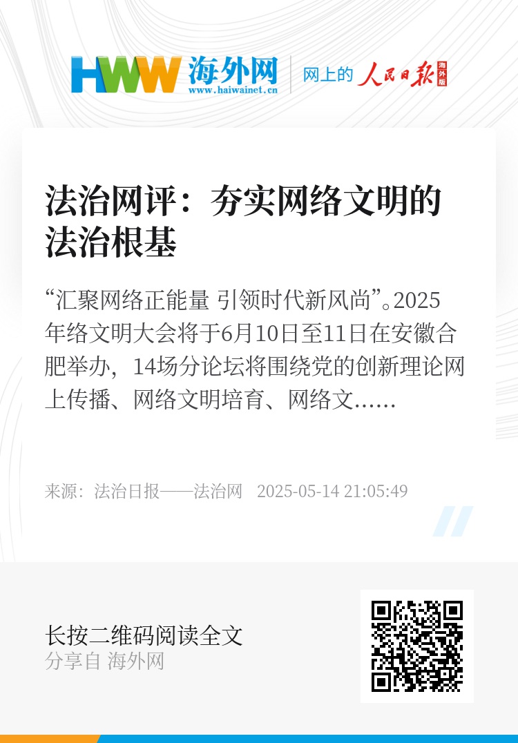 网络空间是亿万民众共同的精神家园。天朗气清、生态良好的网络空间,既符合人民群众的根本利益,也符合国家的安全发展战略需要。以法治力量推动网络文明发展,既为数字中国高质量发展提供重要保障,也为以中国式现代化全面推进网络强国建设筑牢思想基础。夯实网络文明的法治根基,永远在路上!(哈建伟)