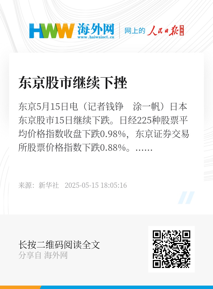 新华社东京5月15日电(记者钱铮 涂一帆)日本东京股市15日继续下跌。日经225种股票平均价格指数收盘下跌0.98%,东京证券交易所股票价格指数下跌0.88%。