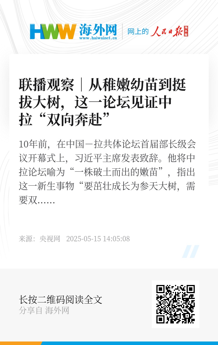 10年后,中拉论坛第四届部长级会议再次在北京举行,习主席在开幕式上发表主旨讲话,称赞“在双方精心培育下,中拉论坛已经从一棵稚嫩幼苗长成挺拔大树”。