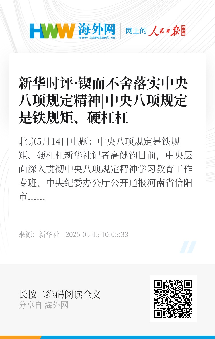 新华社北京5月14日电题:中央八项规定是铁规矩、硬杠杠