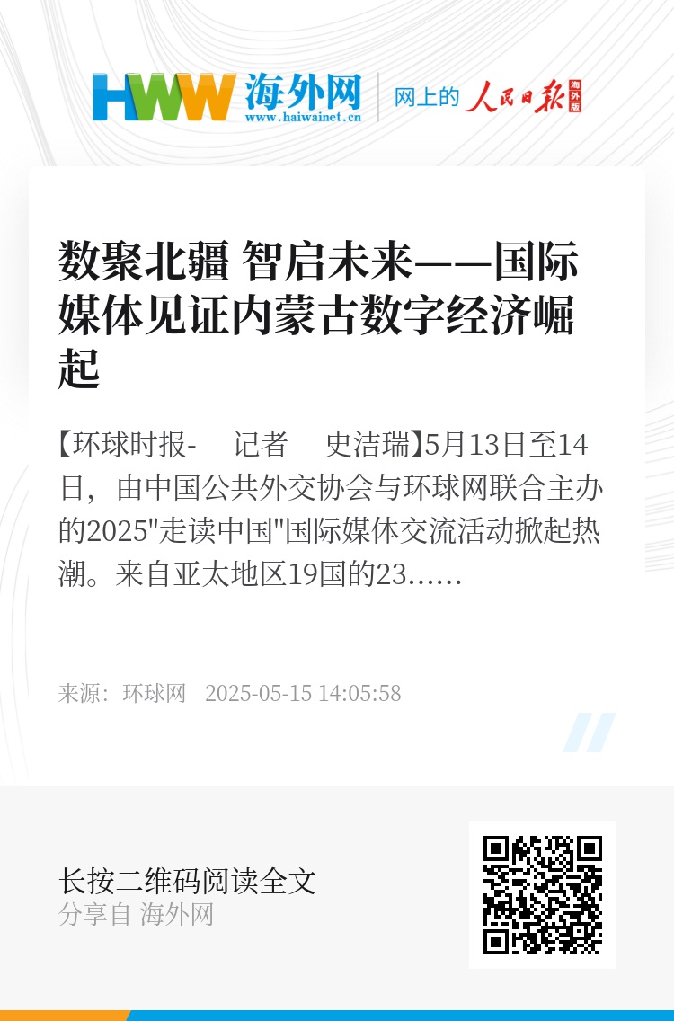 【环球时报-环球网 记者 史洁瑞】5月13日至14日,由中国公共外交协会与环球网联合主办的2025"走读中国"国际媒体交流活动掀起热潮。来自亚太地区19国的23名媒体代表,深度探访内蒙古数字经济三大标杆场景——首府呼和浩特的内蒙古数据交易中心与云谷之境探索港、草原云谷乌兰察布的察哈尔高新技术开发区,切身感受中国北疆数字经济发展的澎湃动能。
