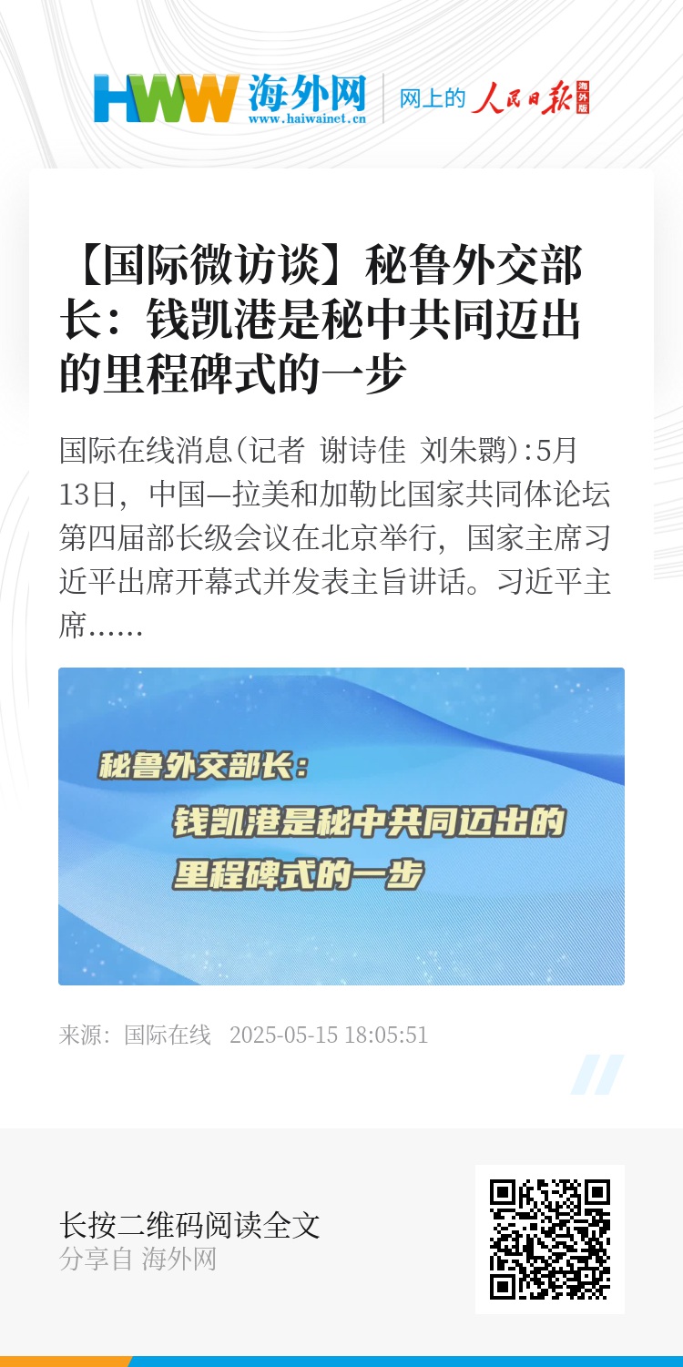 习近平主席在讲话中指出,“新世纪以来特别是近些年来,中拉不断书写着命运与共的佳话”,中拉“勇立潮头、合作共赢”,并特别提及“秘鲁钱凯港顺利开港开启亚拉陆海新通道”。针对这一重要合作项目,秘鲁外交部长斯基亚莱尔(H.E. Elmer Schialer)在接受国际在线专访时作出积极评价,认为它是“秘中双方共同迈出的里程碑式的一步”。