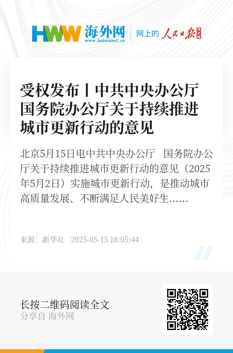 实施城市更新行动,是推动城市高质量发展、不断满足人民美好生活需要的重要举措。为持续推进城市更新行动,经党中央、国务院同意,现提出如下意见。