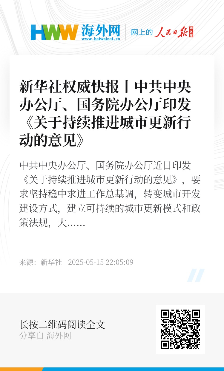 中共中央办公厅、国务院办公厅近日印发《关于持续推进城市更新行动的意见》,要求坚持稳中求进工作总基调,转变城市开发建设方式,建立可持续的城市更新模式和政策法规,大力实施城市更新,促进城市结构优化、功能完善、文脉赓续、品质提升,打造宜居、韧性、智慧城市。