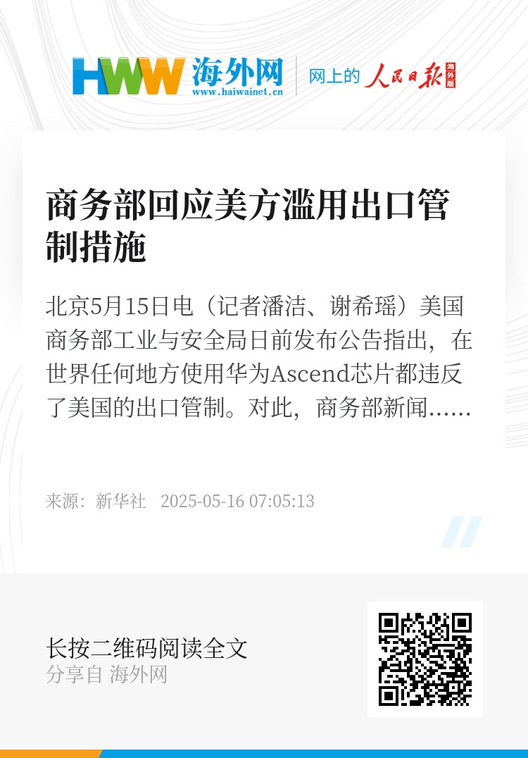 新华社北京5月15日电(记者潘洁、谢希瑶)美国商务部工业与安全局日前发布公告指出,在世界任何地方使用华为Ascend芯片都违反了美国的出口管制。对此,商务部新闻发言人何咏前15日表示,美方公告是典型的非市场和单边霸凌做法,充分暴露其单边主义、保护主义本质。