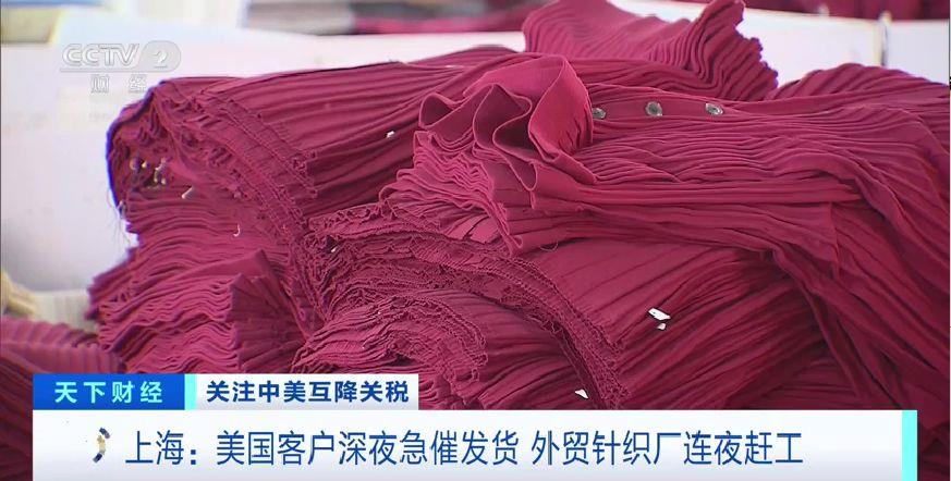 在中美大幅互降关税后,位于上海松江区李塔汇镇的一家针织厂,接到了美国客户可以出货的通知。已经在包装车间里堆了1个月的50000多件成衣,终于可以开启最后的工序,车间内的工人全员上岗,缝商标、熨烫、打吊牌,各个工序有条不紊。