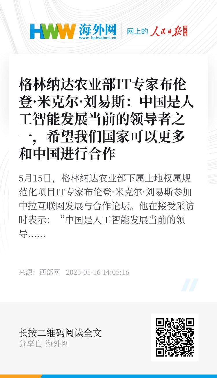 5月15日,格林纳达农业部下属土地权属规范化项目IT专家布伦登·米克尔·刘易斯参加中拉互联网发展与合作论坛。他在接受采访时表示:“中国是人工智能发展当前的领导者之一,所以希望我们国家可以更多和中国进行合作。”
