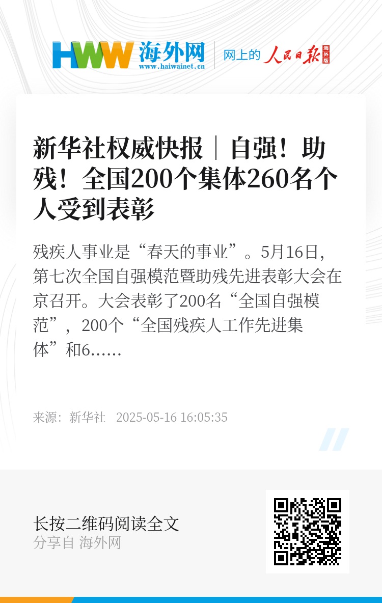 5月16日,第七次全国自强模范暨助残先进表彰大会在京召开。大会表彰了200名“全国自强模范”,200个“全国残疾人工作先进集体”和60名“全国残疾人工作先进个人”。