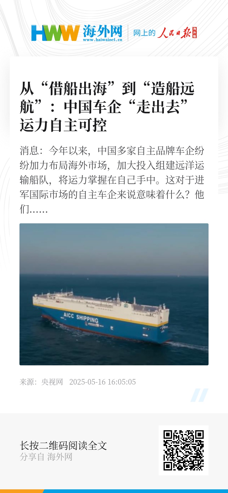 中国汽车工业协会副秘书长 柳燕:从“借船出海”到“造船远航”,不仅有效增强供应链的韧性与稳定,更进一步打破国际航运垄断,掌握中国汽车产业在全球价值链中的话语权,让中国品牌更好地“走出去”。