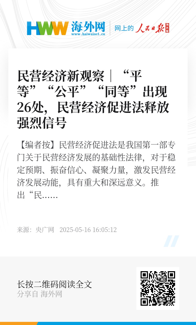 【编者按】民营经济促进法是我国第一部专门关于民营经济发展的基础性法律,对于稳定预期、振奋信心、凝聚力量,激发民营经济发展动能,具有重大和深远意义。央广网推出“民营经济新观察”系列报道,通过权威政策解读、跨领域专家访谈、典型企业案例等,透视法治力量如何破除隐性壁垒、激活创新动能、推动民营经济高质量发展稳步前行。