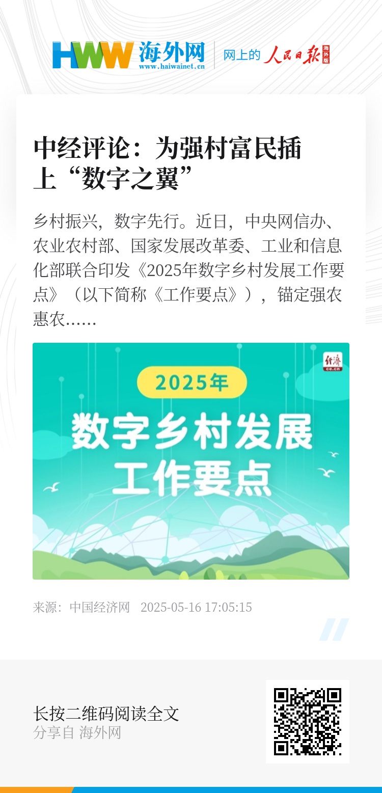 “数”连万物,“数”享未来。为强村富民插上“数字之翼”,乡村振兴的步伐必将更加稳健有力。(中国经济网评论员 梁瑜)