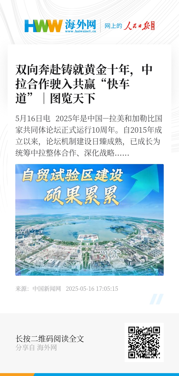 中新网5月16日电 2025年是中国-拉美和加勒比国家共同体论坛正式运行10周年。自2015年成立以来,论坛机制建设日臻成熟,已成长为统筹中拉整体合作、深化战略对接、构建命运共同体的核心平台。