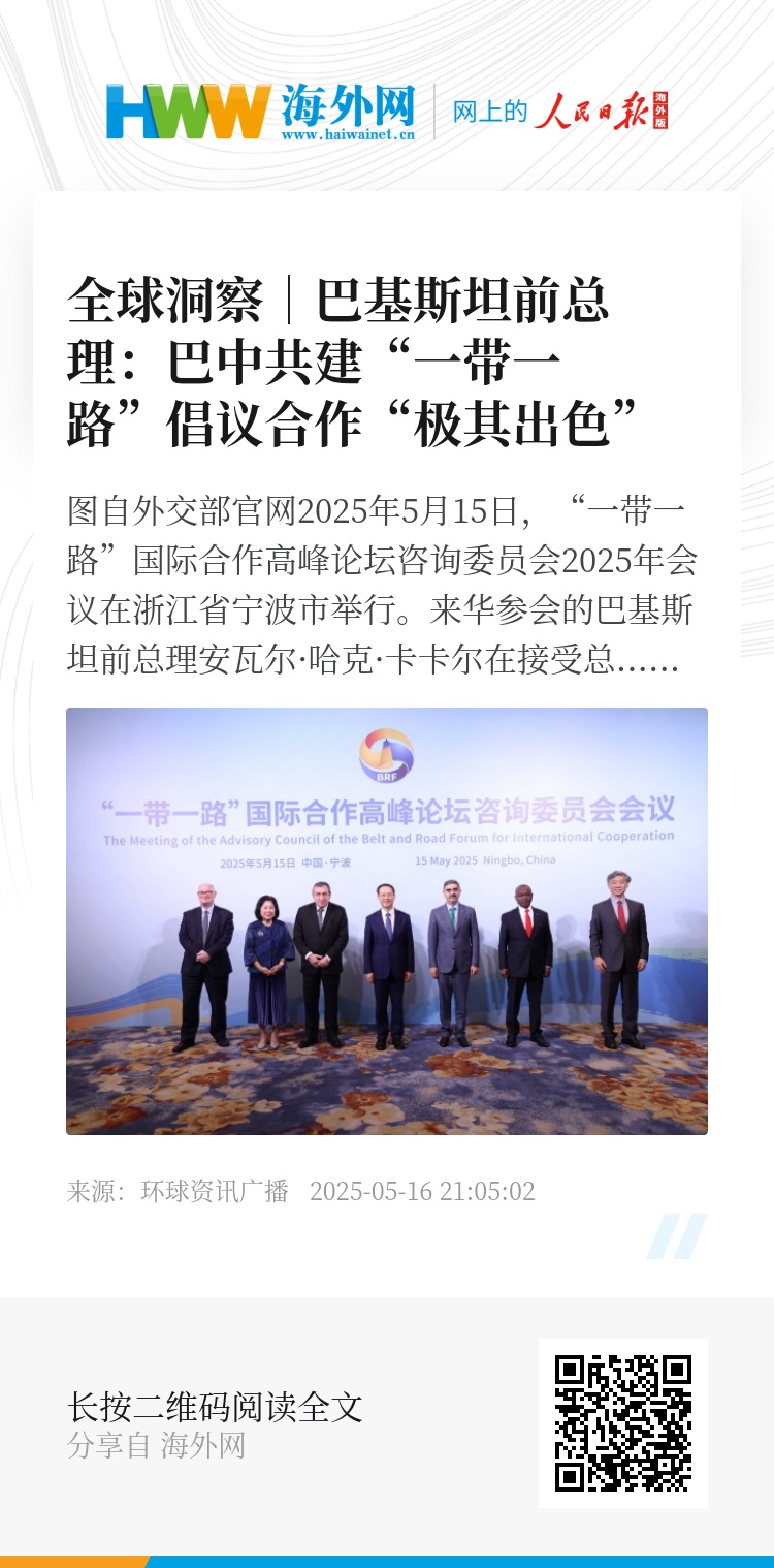 来华参会的巴基斯坦前总理安瓦尔·哈克·卡卡尔在接受总台记者独家专访时,高度评价巴中两国之间在共建“一带一路”倡议框架下开展的合作。