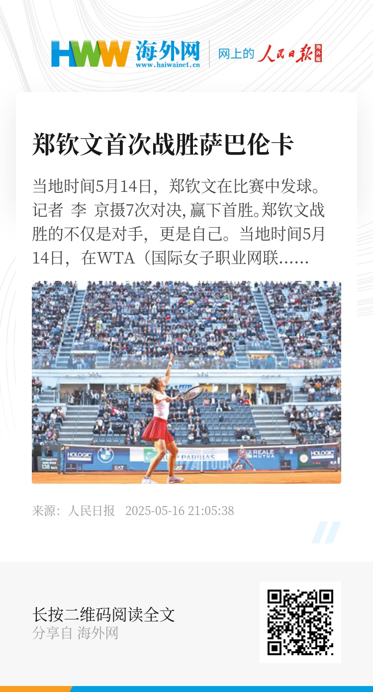 当地时间5月14日,在WTA(国际女子职业网联)1000罗马站1/4决赛中,中国球员郑钦文以6∶4、6∶3战胜世界排名第一、白俄罗斯名将萨巴伦卡,首次闯入红土WTA1000赛四强的同时,也终结了对方的WTA1000赛15连胜。
