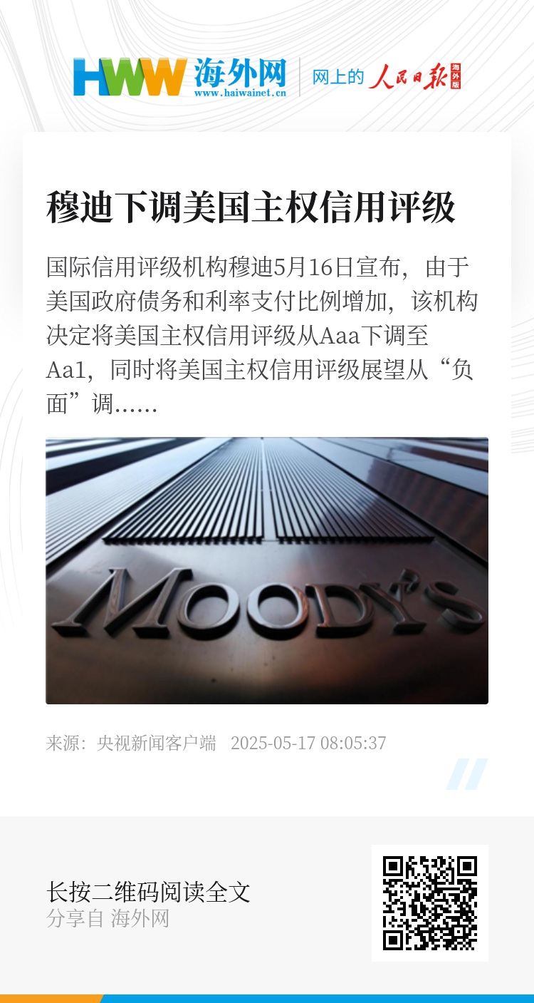 国际信用评级机构穆迪5月16日宣布,由于美国政府债务和利率支付比例增加,该机构决定将美国主权信用评级从Aaa下调至Aa1,同时将美国主权信用评级展望从“负面”调整为“稳定”。(央视记者 刘骁骞)