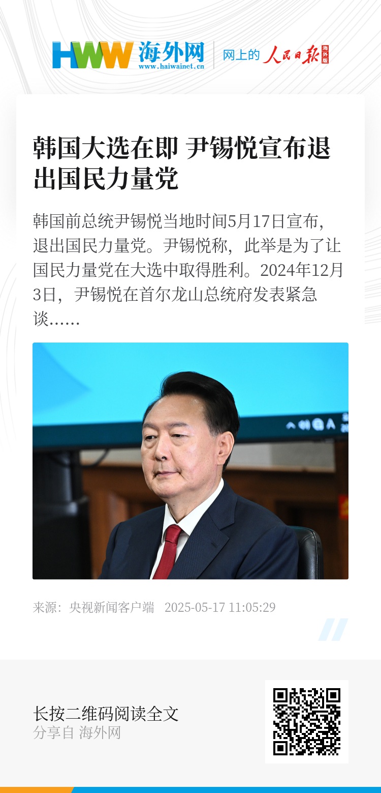 韩国前总统尹锡悦当地时间5月17日宣布,退出国民力量党。尹锡悦称,此举是为了让国民力量党在大选中取得胜利。