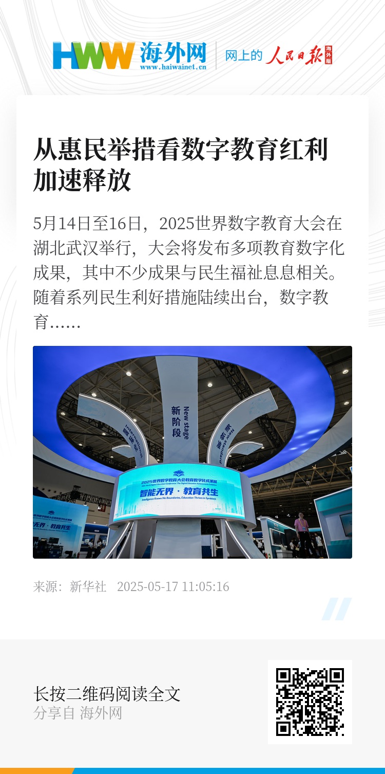5月14日至16日,2025世界数字教育大会在湖北武汉举行,大会将发布多项教育数字化成果,其中不少成果与民生福祉息息相关。随着系列民生利好措施陆续出台,数字教育发展带来的惠民实效正加速显现。