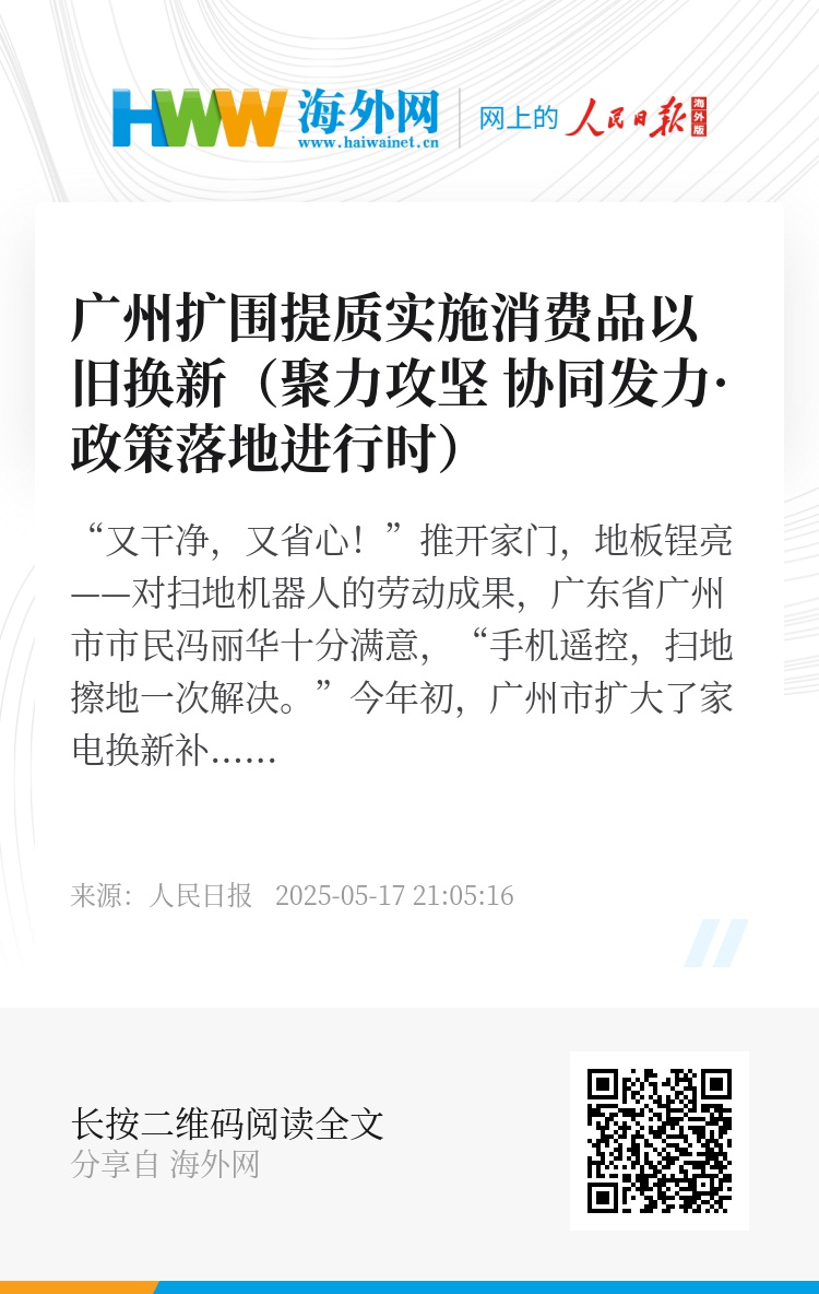 今年4月出台的广州市培育建设国际消费中心城市2025年工作要点,提出5个方面措施,明确将加力扩围消费品以旧换新,进一步明确补贴方向、加大补贴力度,结合产业和居民消费实际增加补贴品类,让更多高质量耐用消费品进入居民生活。
