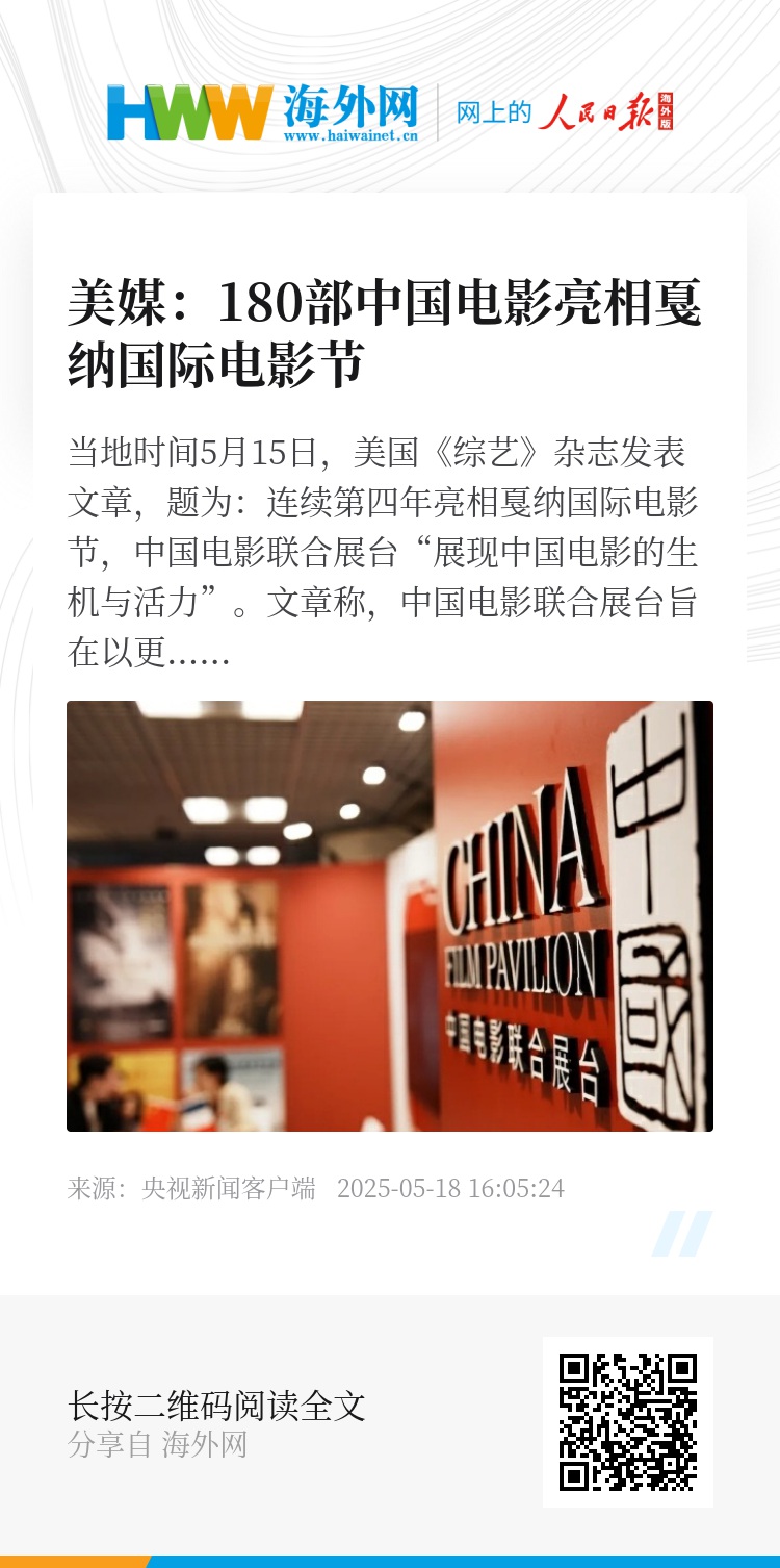 文章称,中国电影联合展台旨在以更多元的方式向世界展示中国电影的生机与活力,促进中国电影人与海外资源的融合。业内人士说,联合展台旨在进一步推进国际电影交易,搭建电影交流与合作的桥梁,增进中外电影界的相互了解和文化交流。