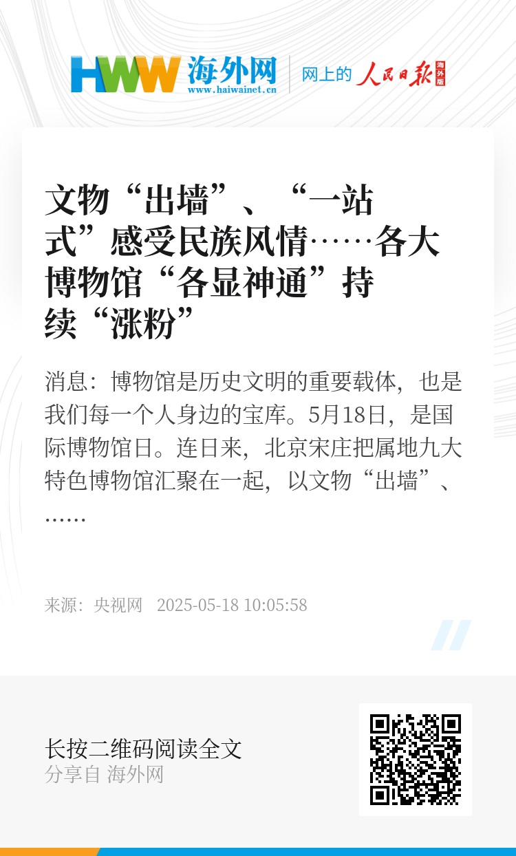 央视网消息:博物馆是历史文明的重要载体,也是我们每一个人身边的宝库。5月18日,是国际博物馆日。连日来,北京宋庄把属地九大特色博物馆汇聚在一起,以文物“出墙”、 移动联展 、科普课堂等形式,进乡村、校园、社区,打造“没有围墙的博物馆”。