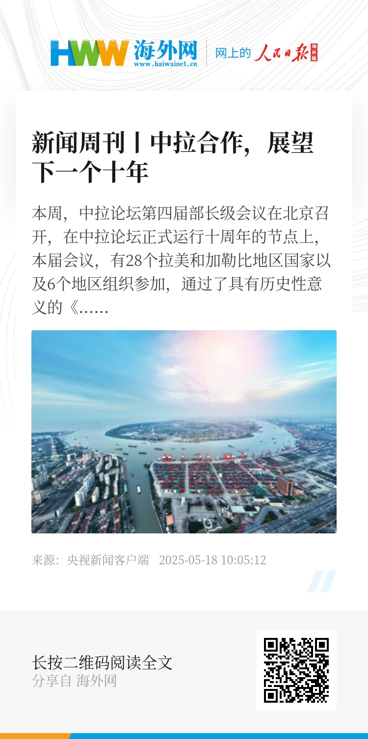 眼下,举办中拉论坛这样的会议,大家一起来谈合作、谋发展,不容易。本周,巴西总统卢拉的一段表态,也引发了不少人的共鸣。他说,离开中国返回巴西的时候,我比来的时候更加乐观了,因为我看到了世界和平的前景,看到了世界发展的前景。事实上,在踏上归程的时候,很多参会的各国代表都通过社交媒体,表达了类似的声音。平等、互利、开放,在关税战背景下,这样的声音格外需要被珍视。本周,在谈论中拉关系时,大家都不约而同地会引用一句拉美谚语,叫“拥有朋友就拥有宝藏”,这像我们中国人常说的“朋友多了路好走”。希望我们能和更多的朋友一起,走向下一个更好的十年。