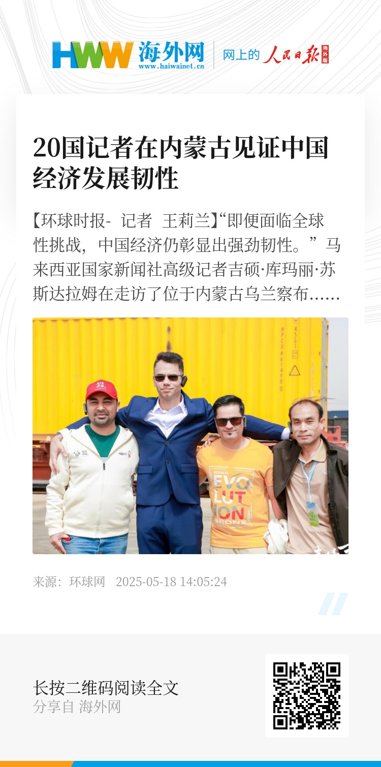 【环球时报-环球网 记者 王莉兰】“即便面临全球性挑战,中国经济仍彰显出强劲韧性。”马来西亚国家新闻社高级记者吉硕·库玛丽·苏斯达拉姆在走访了位于内蒙古乌兰察布的七苏木国际物流园区后表示,“中国的稳定对区域经济至关重要,其通过政策改革与内需驱动实现动态调适的能力,持续为全球经济注入信心。”