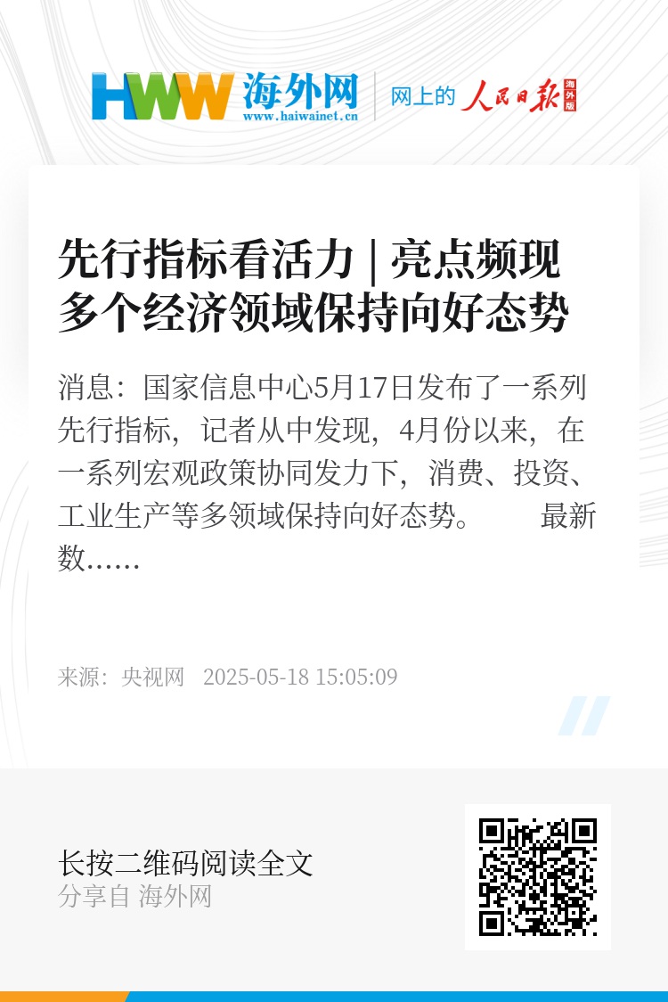 央视网消息:国家信息中心5月17日发布了一系列先行指标,记者从中发现,4月份以来,在一系列宏观政策协同发力下,消费、投资、工业生产等多领域保持向好态势。