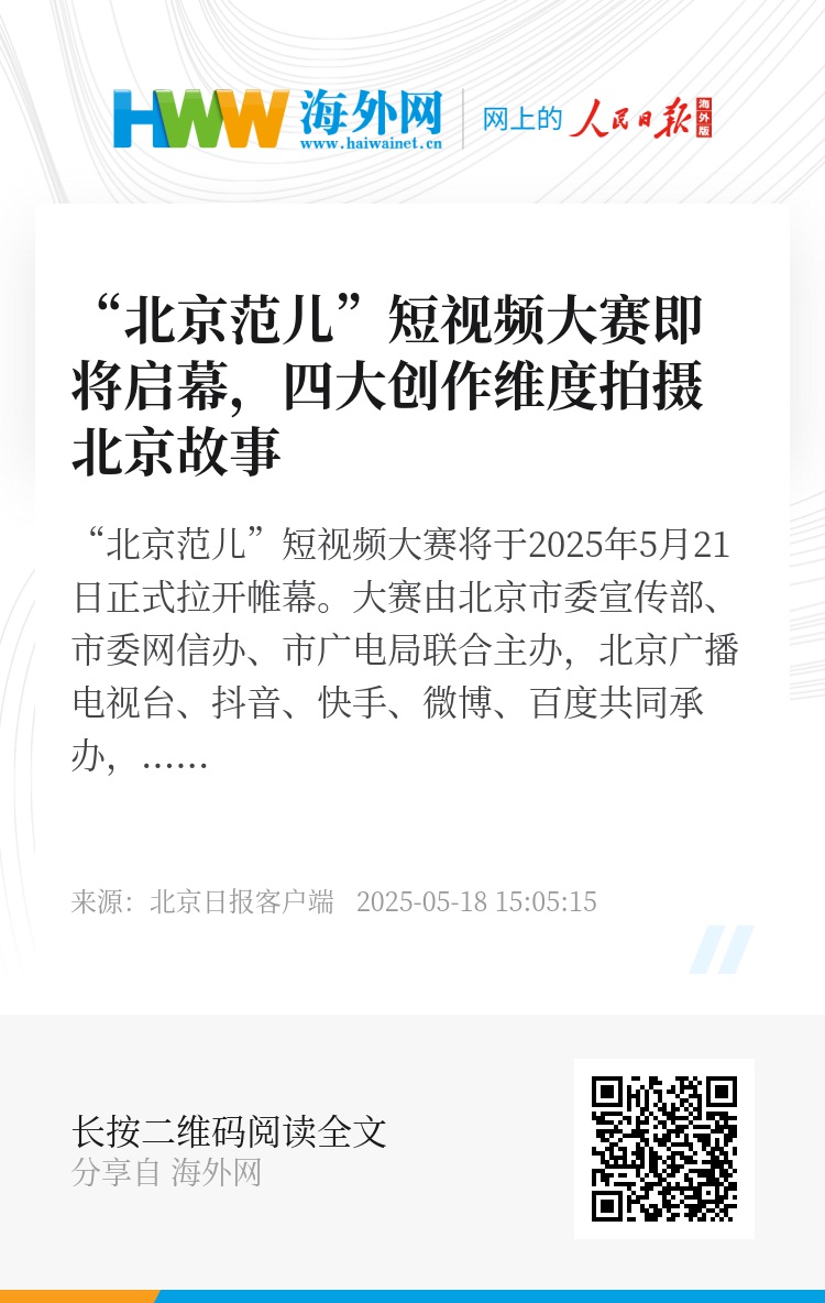 “北京范儿”短视频大赛将于2025年5月21日正式拉开帷幕。大赛由北京市委宣传部、市委网信办、市广电局联合主办,北京广播电视台、抖音、快手、微博、百度共同承办,旨在以短视频为载体,通过全民参与、多屏联动、国际传播的创新模式,构建“大屏小屏联动、线上线下共振、国内国际破圈”的全媒体传播矩阵,打造具有首都特色、全国示范、国际影响的全国文化中心标识性新品牌,立体展现新时代首都高质量发展成就,营造团结和谐、昂扬奋进的社会氛围,实现社会效益和经济效益双丰收。