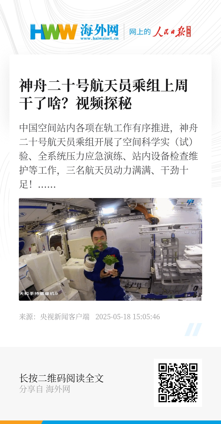 神舟二十号航天员乘组上周干了啥?视频探秘