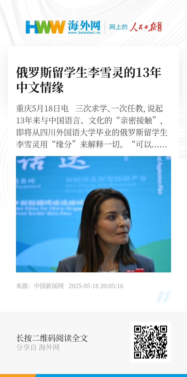 中新网重庆5月18日电 三次求学、一次任教,说起13年来与中国语言、文化的“亲密接触”,即将从四川外国语大学毕业的俄罗斯留学生李雪灵用“缘分”来解释一切。