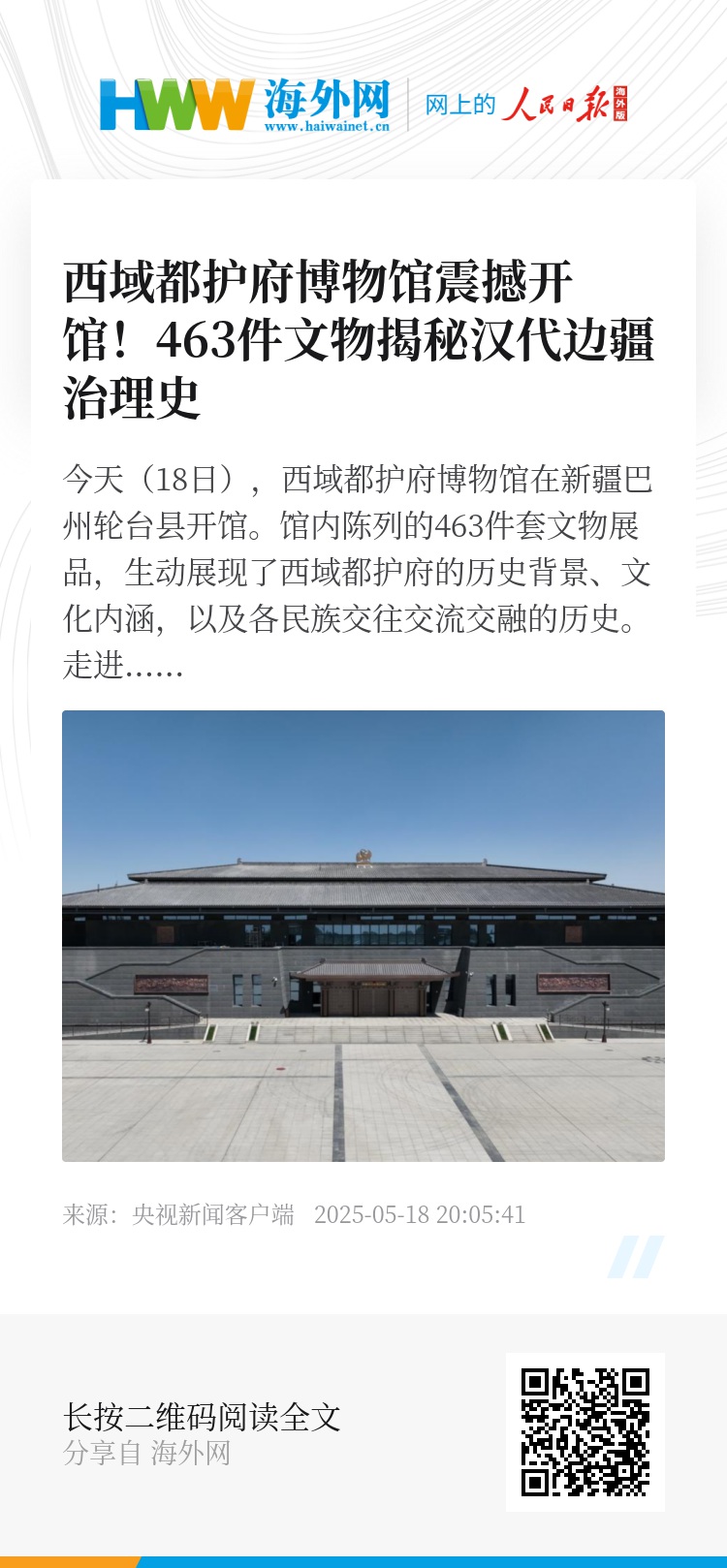 今天(18日),西域都护府博物馆在新疆巴州轮台县开馆。馆内陈列的463件套文物展品,生动展现了西域都护府的历史背景、文化内涵,以及各民族交往交流交融的历史。