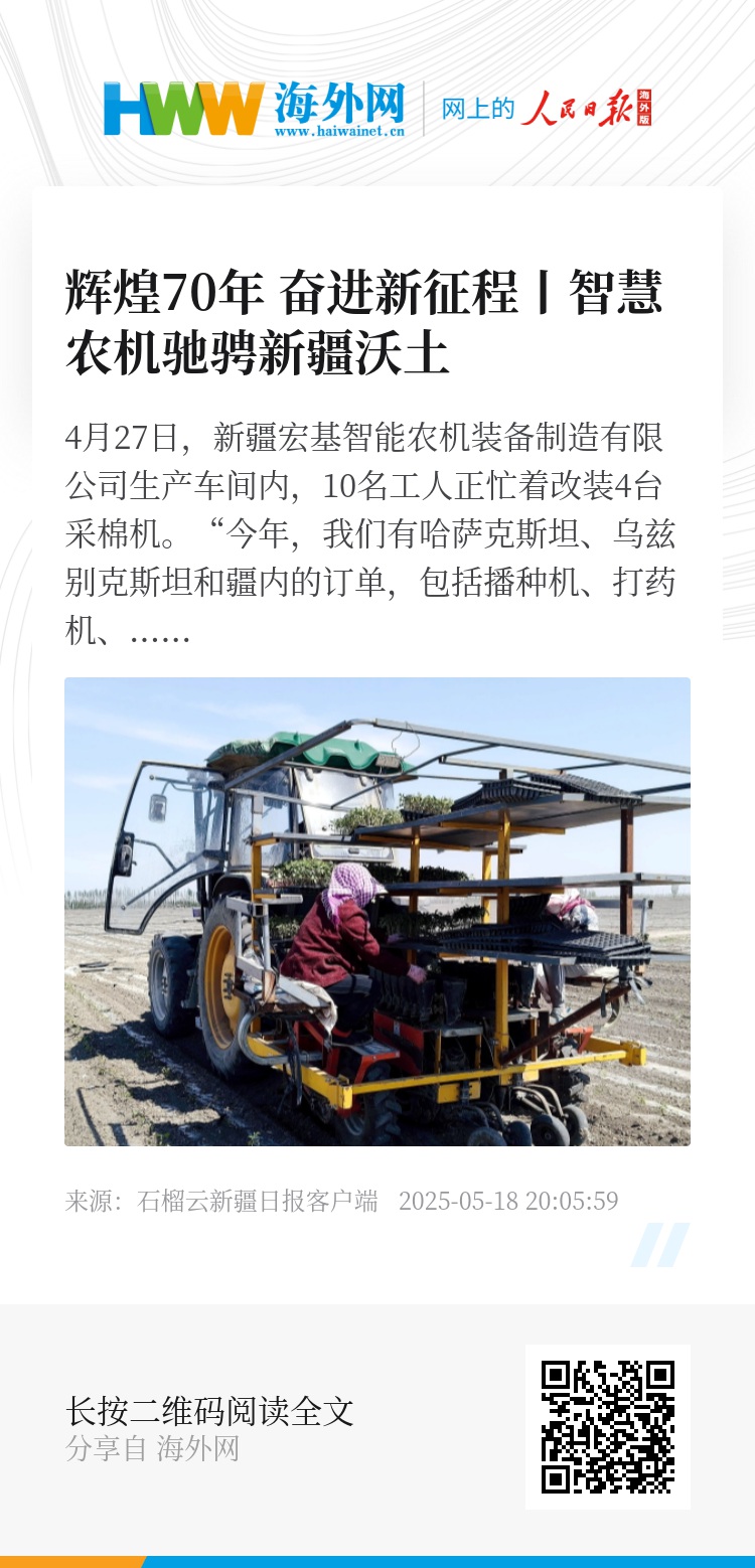 从个人贷款购买采棉机,到牵头领办农机合作社、联合社,再到创办农机制造企业,韩波见证了以采棉机为代表的多种农机设备走出国门、远销海外,在国际农机市场上崭露头角、占据一席之地。