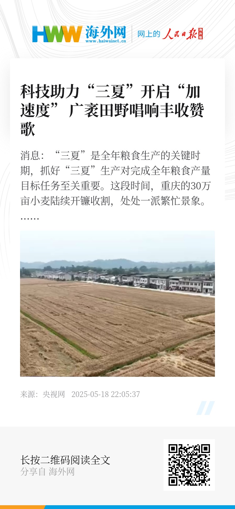 央视网消息:“三夏”是全年粮食生产的关键时期,抓好“三夏”生产对完成全年粮食产量目标任务至关重要。这段时间,重庆的30万亩小麦陆续开镰收割,处处一派繁忙景象。