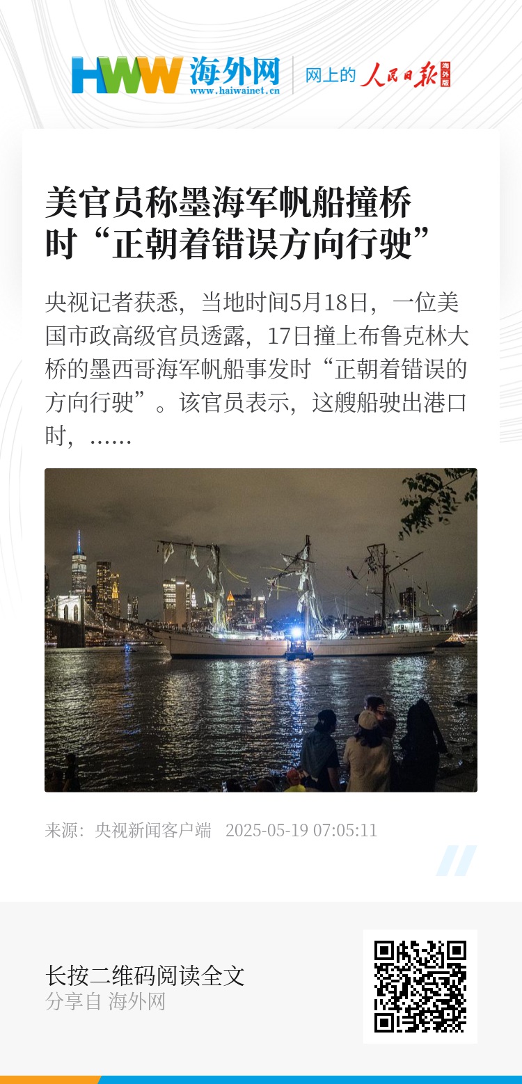 央视记者获悉,当地时间5月18日,一位美国市政高级官员透露,17日撞上布鲁克林大桥的墨西哥海军帆船事发时“正朝着错误的方向行驶”。