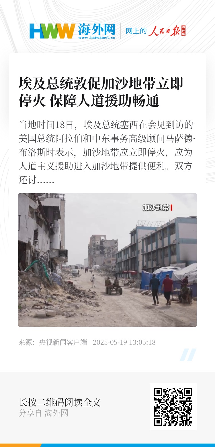 当地时间18日,埃及总统塞西在会见到访的美国总统阿拉伯和中东事务高级顾问马萨德·布洛斯时表示,加沙地带应立即停火,应为人道主义援助进入加沙地带提供便利。
