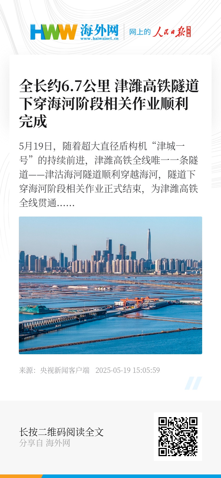 据了解,津潍高铁起自天津枢纽滨海站,终至济青高铁潍坊北站,正线长度348.9公里,共设车站10座,设计时速350公里。其中,津沽海河隧道全长约6.7公里,是津潍高铁全线唯一一条隧道,也是海河上洞径最大的高铁盾构隧道。