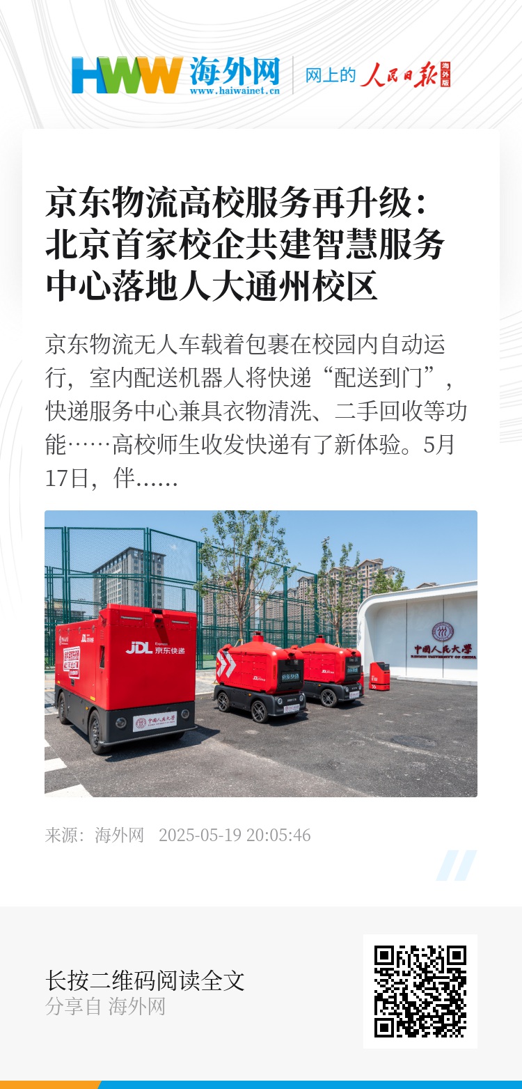 此次合作既标志着京东物流在高校场景下的服务模式创新又迈出重要一步,也是中国人民大学提升校园综合服务保障能力的一项重要实践成果。