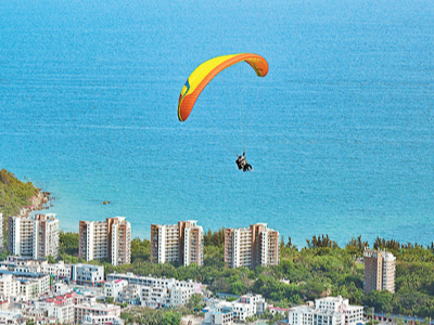 游客在海南陵水红角岭国际滑翔伞飞行营地体验滑翔伞飞行。