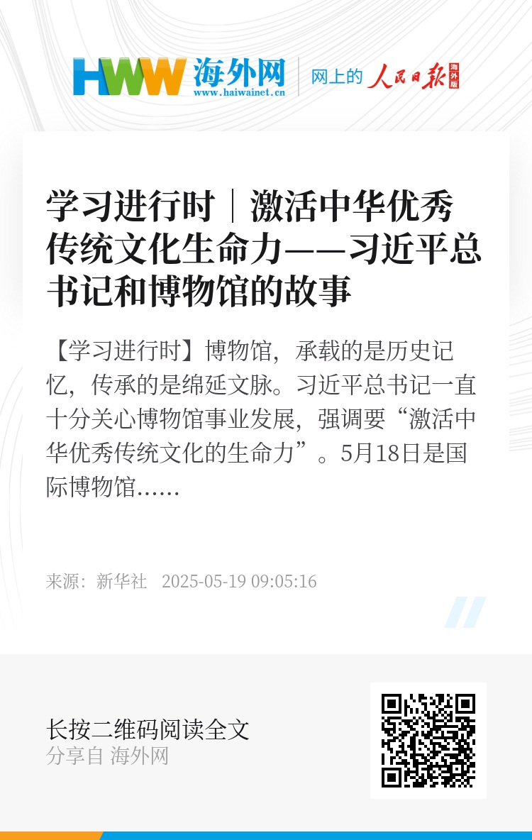 【学习进行时】博物馆,承载的是历史记忆,传承的是绵延文脉。习近平总书记一直十分关心博物馆事业发展,强调要“激活中华优秀传统文化的生命力”。5月18日是国际博物馆日。新华社《学习进行时》推出文章,一起重温习近平总书记和博物馆的故事。