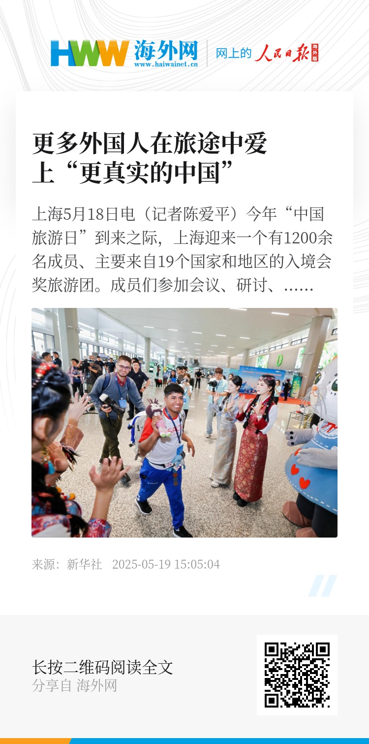 新华社上海5月18日电(记者陈爱平)今年“中国旅游日”到来之际,上海迎来一个有1200余名成员、主要来自19个国家和地区的入境会奖旅游团。成员们参加会议、研讨、考察之余,漫步上海街区、品美食、购物,大赞短短几天,已深深爱上了中国城市。