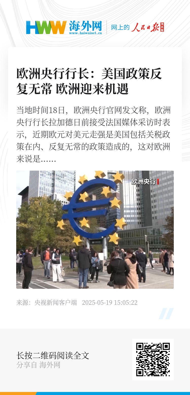 当地时间18日,欧洲央行官网发文称,欧洲央行行长拉加德日前接受法国媒体采访时表示,近期欧元对美元走强是美国包括关税政策在内、反复无常的政策造成的,这对欧洲来说是一个机遇。