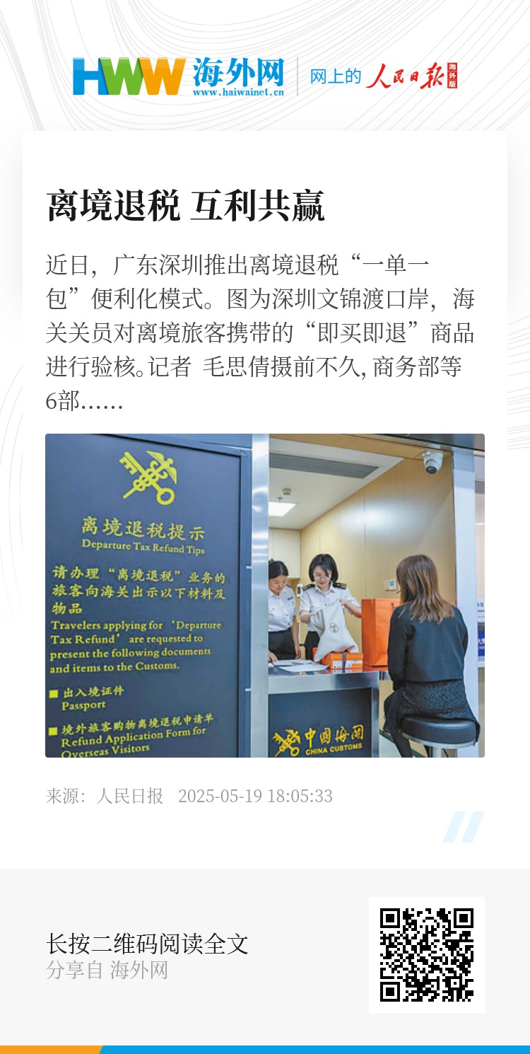 前不久,商务部等6部门发布《关于进一步优化离境退税政策扩大入境消费的通知》。进一步优化离境退税政策,有利于提高境外旅客在华购物的便利性,提升旅游、消费的获得感、满意度,有利于吸引更多外国人来华购物、旅游,推动更多“老字号”“新国潮”走向世界,实现国内国际市场相互联通、相互促进。