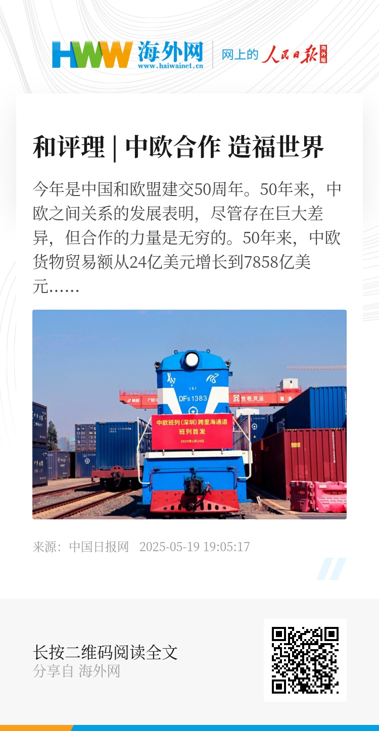 今年是中国和欧盟建交50周年。50年来,中欧之间关系的发展表明,尽管存在巨大差异,但合作的力量是无穷的。