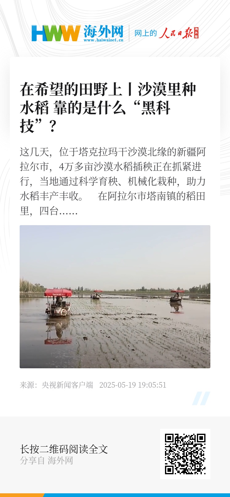 这几天,位于塔克拉玛干沙漠北缘的新疆阿拉尔市,4万多亩沙漠水稻插秧正在抓紧进行,当地通过科学育秧、机械化栽种,助力水稻丰产丰收。