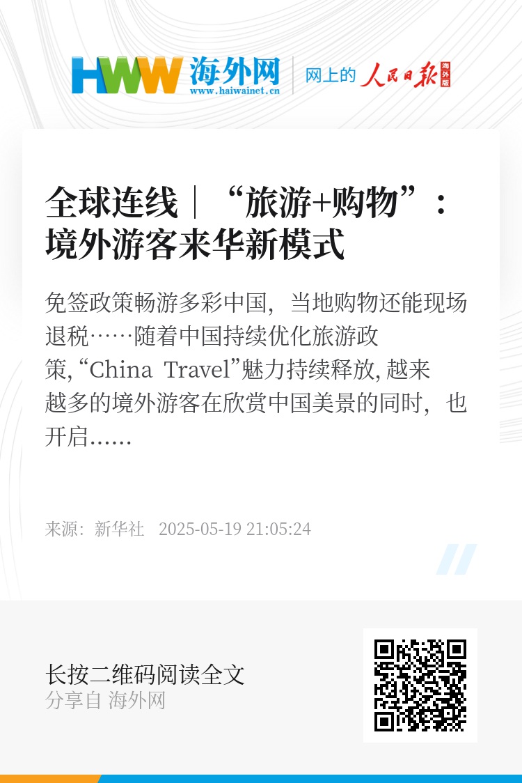 免签政策畅游多彩中国,当地购物还能现场退税……随着中国持续优化旅游政策,“China Travel”魅力持续释放,越来越多的境外游客在欣赏中国美景的同时,也开启了“China Shopping”购物模式。