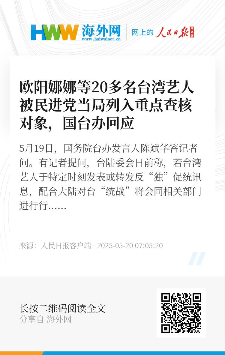 有记者提问,台陆委会日前称,若台湾艺人于特定时刻发表或转发反“独”促统讯息,配合大陆对台“统战”将会同相关部门进行行政查核,目前已将欧阳娜娜等20多名艺人列入重要查核对象。请问对此有何评论?