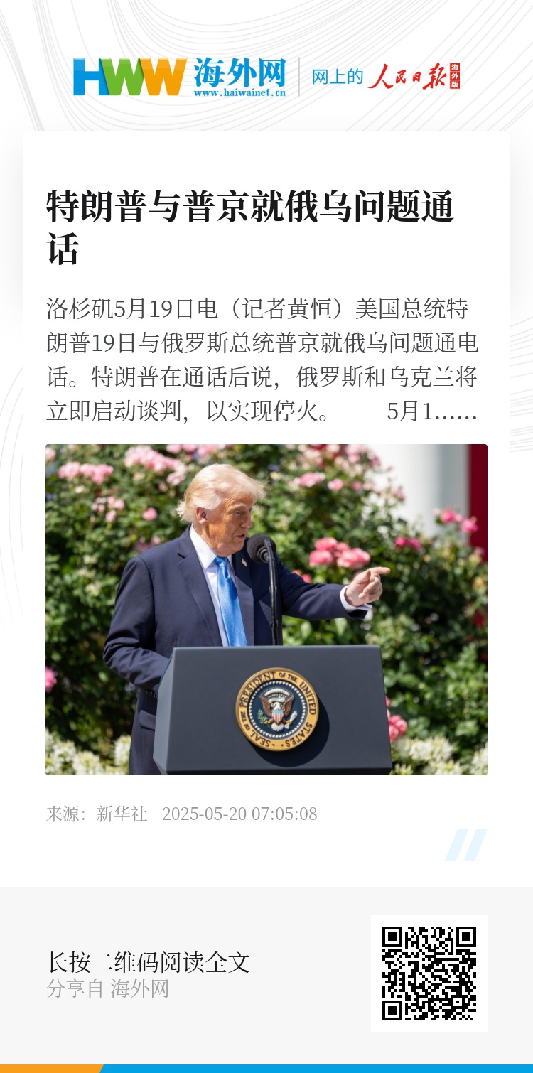 新华社洛杉矶5月19日电(记者黄恒)美国总统特朗普19日与俄罗斯总统普京就俄乌问题通电话。特朗普在通话后说,俄罗斯和乌克兰将立即启动谈判,以实现停火。